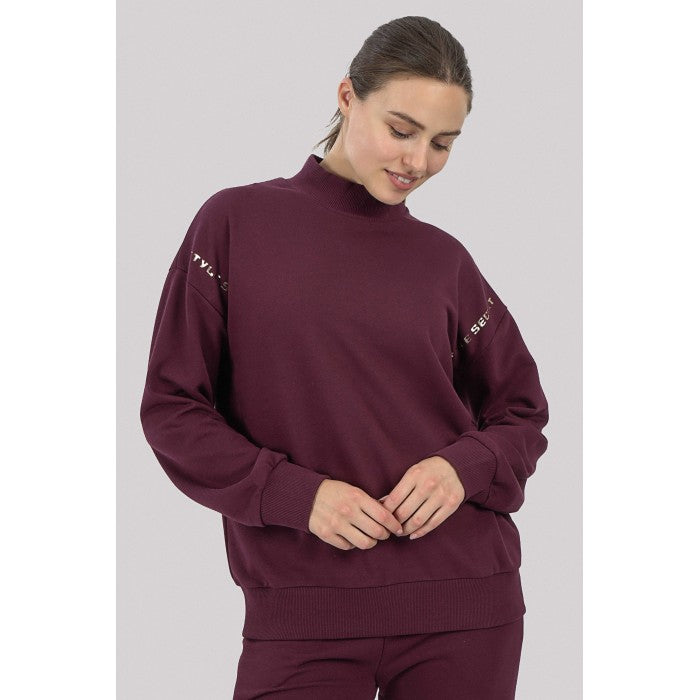 Стилна и удобна блуза в бордо цвят, която впечатлява със семпъл, но елегантен дизайн. Моделът е със свободна кройка и висока рипсена яка, която осигурява комфорт и защита в по-хладните дни. Декоративните надписи по ръкавите добавят модерен акцент. Завършен е с рипсени маншети и ластичен подгъв за перфектно прилягане.