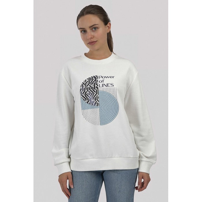 Модерна и удобна блуза в класически бял цвят, декориран с ефектен графичен принт и надпис Power of Lines. Изработена е от мека материя със свободна кройка, която осигурява комфорт и свобода на движенията. Завършена е с рипсени маншети и ластичен подгъв за перфектно прилягане.
