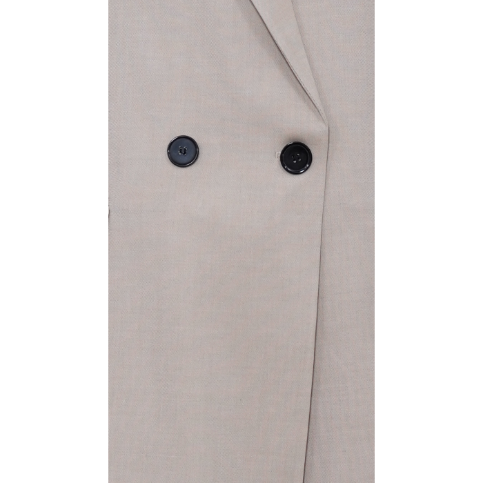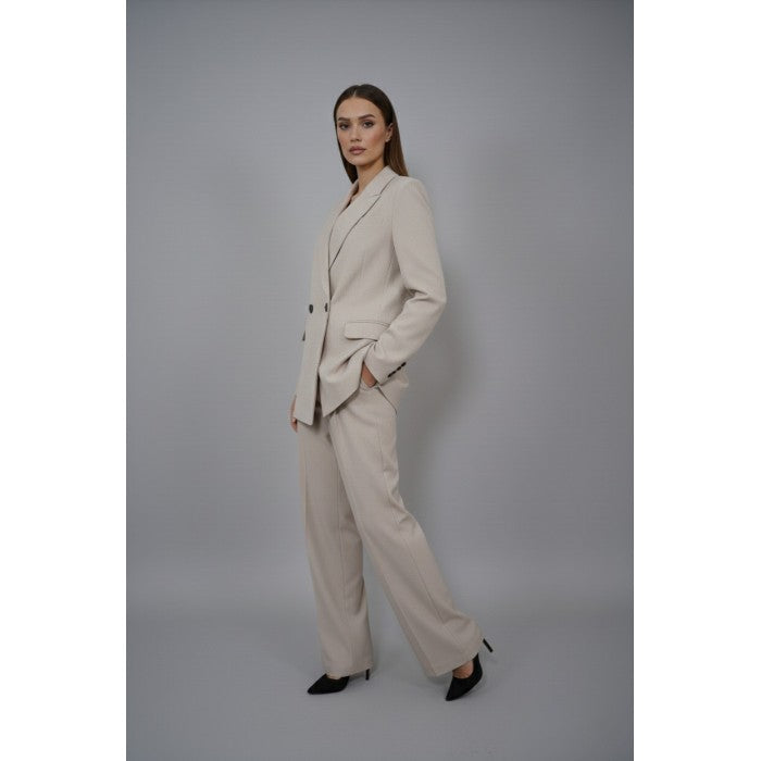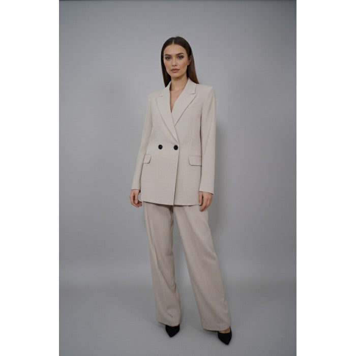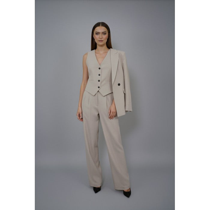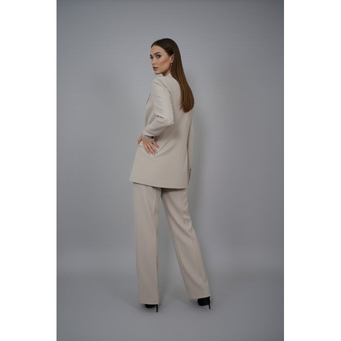 Този изискан комплект е перфектното съчетание между класика и модерна визия. Състои се от три части – елече с копчета, дълъг панталон с висока талия и широк крачол, и сако с двуредно закопчаване. Светлият бежов нюанс го прави универсален и лесен за комбиниране, а кройката подчертава силуета и придава увереност.