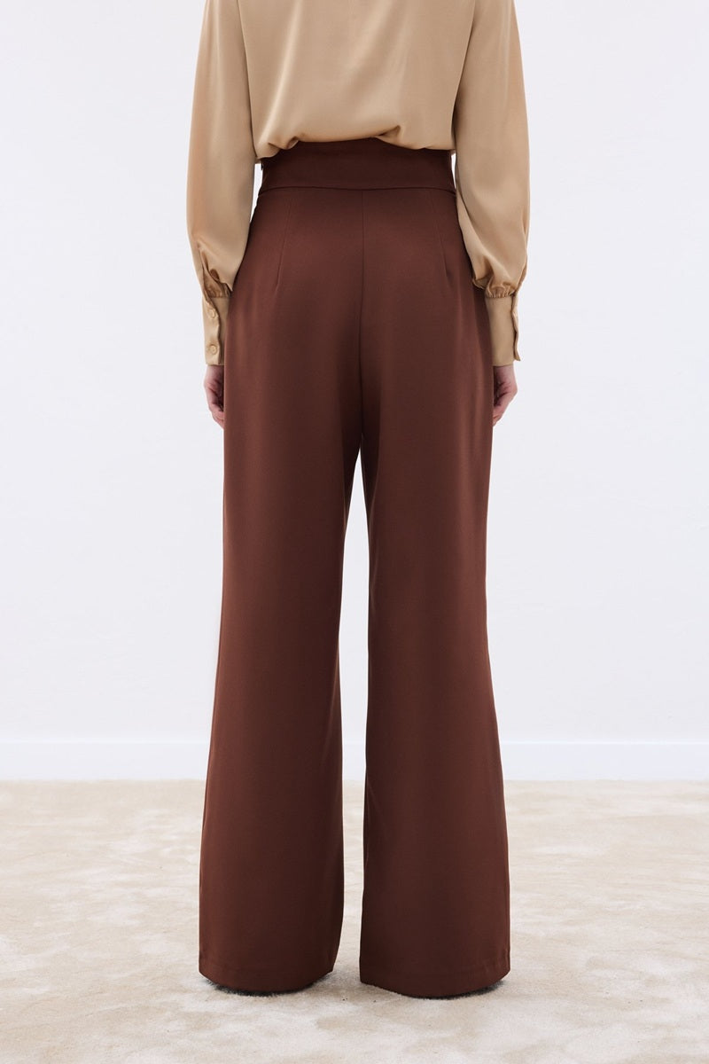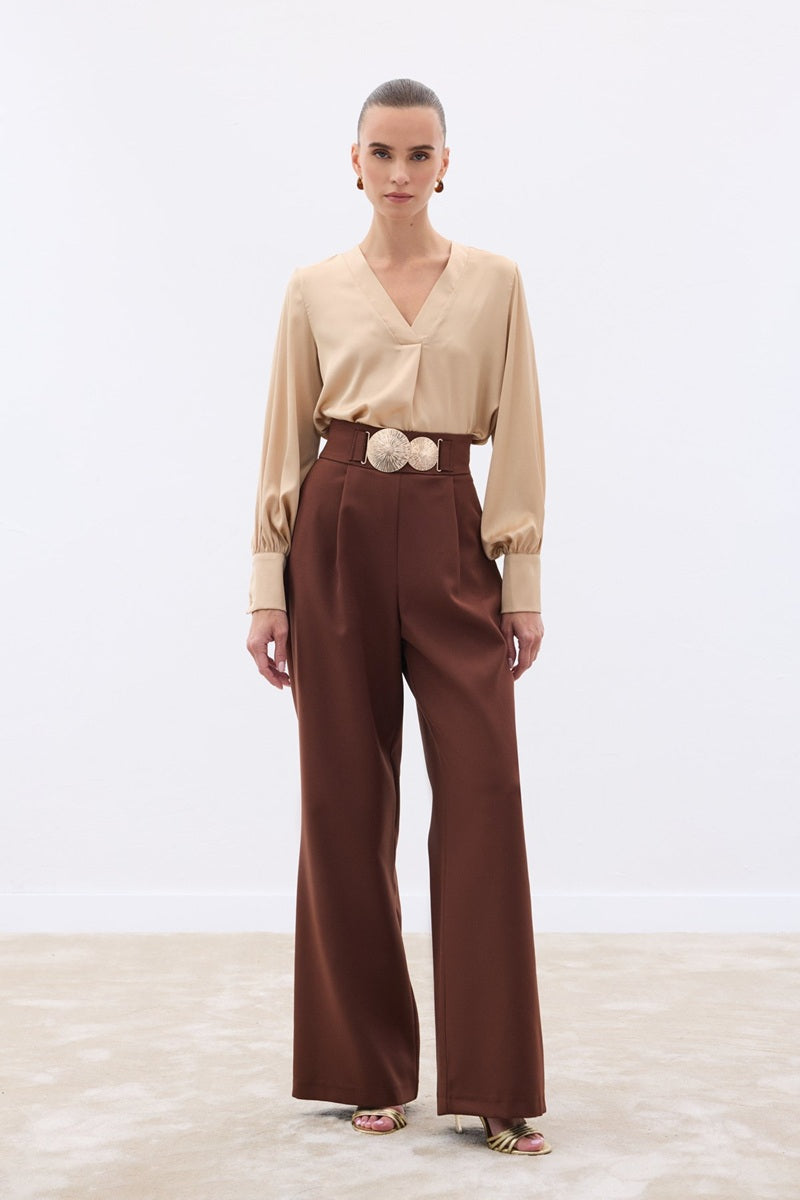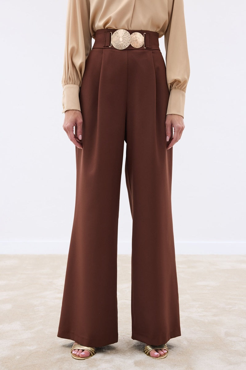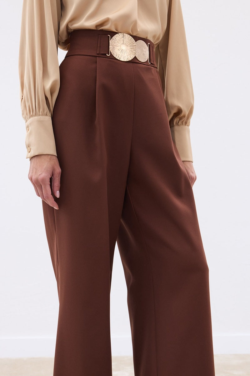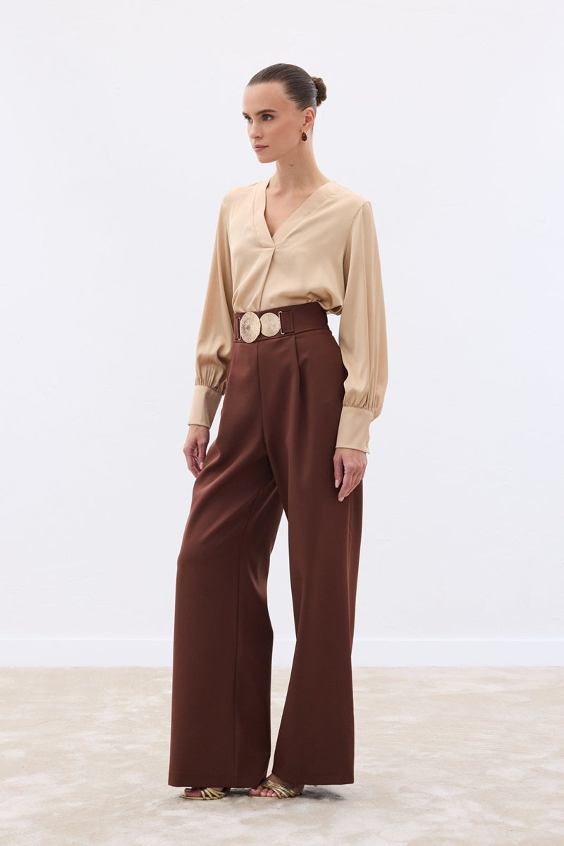 Стилен панталон с изчистена линия и елегантен силует, подчертаващ талията. Моделът е изработен от мека, фина материя, която пада красиво и осигурява комфорт при носене. Високата талия и широкият колан със златна декоративна тока, наподобяваща пафти, добавят акцент и изтънченост. Широкият крачол визуално удължава силуета и придава модерно излъчване.