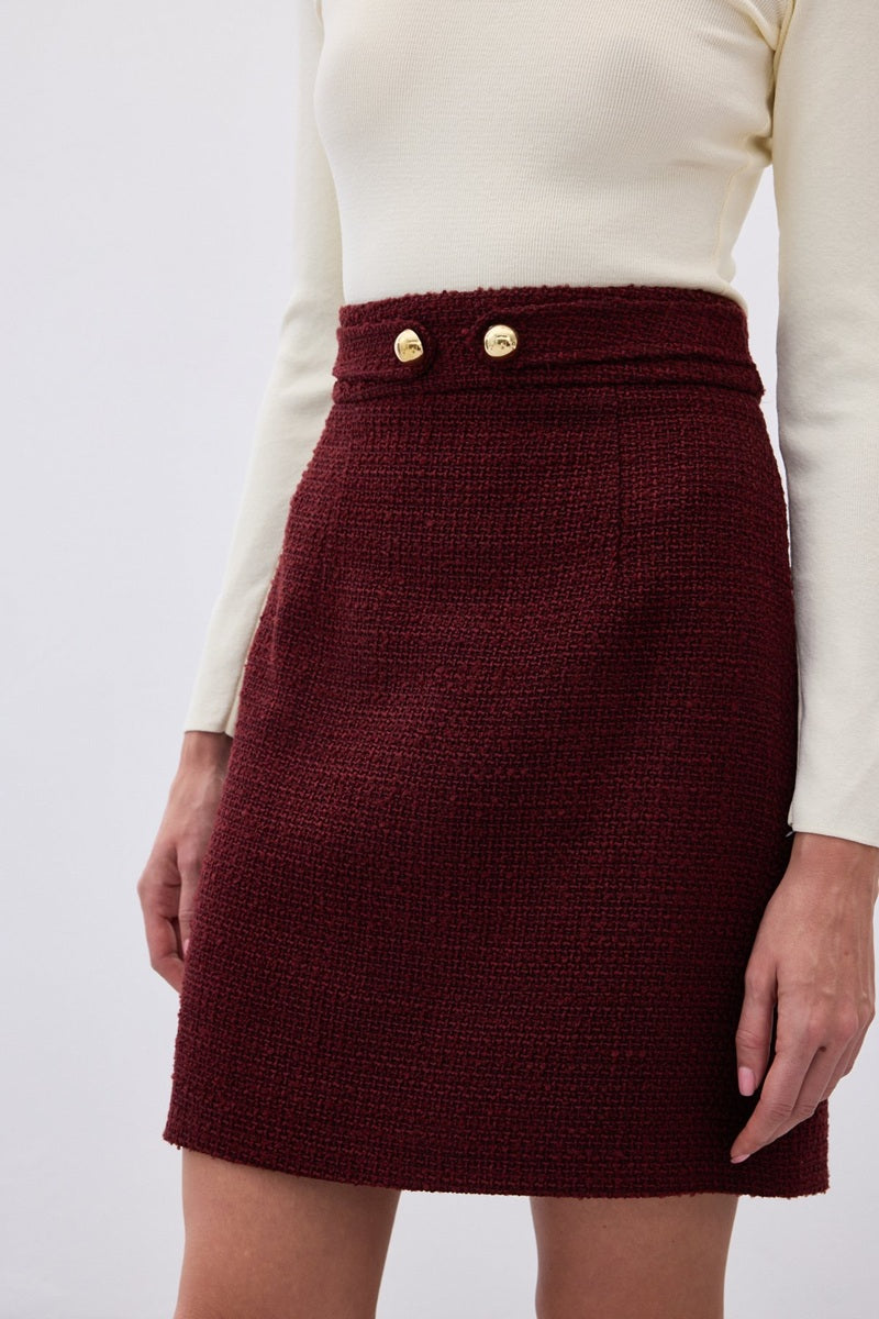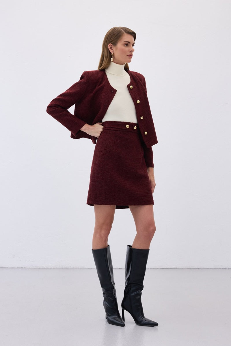 Изискан и стилен комплект, съчетаващ елегантност и модерен дух. Състои се от късо сако и мини пола в бордо нюанс, изработени от висококачествен туид с фина текстура. Сакото е с права кройка и златни декоративни копчета, които добавят луксозен акцент. Полата е с висока талия и същите детайли, създавайки перфектна хармония между двете части.