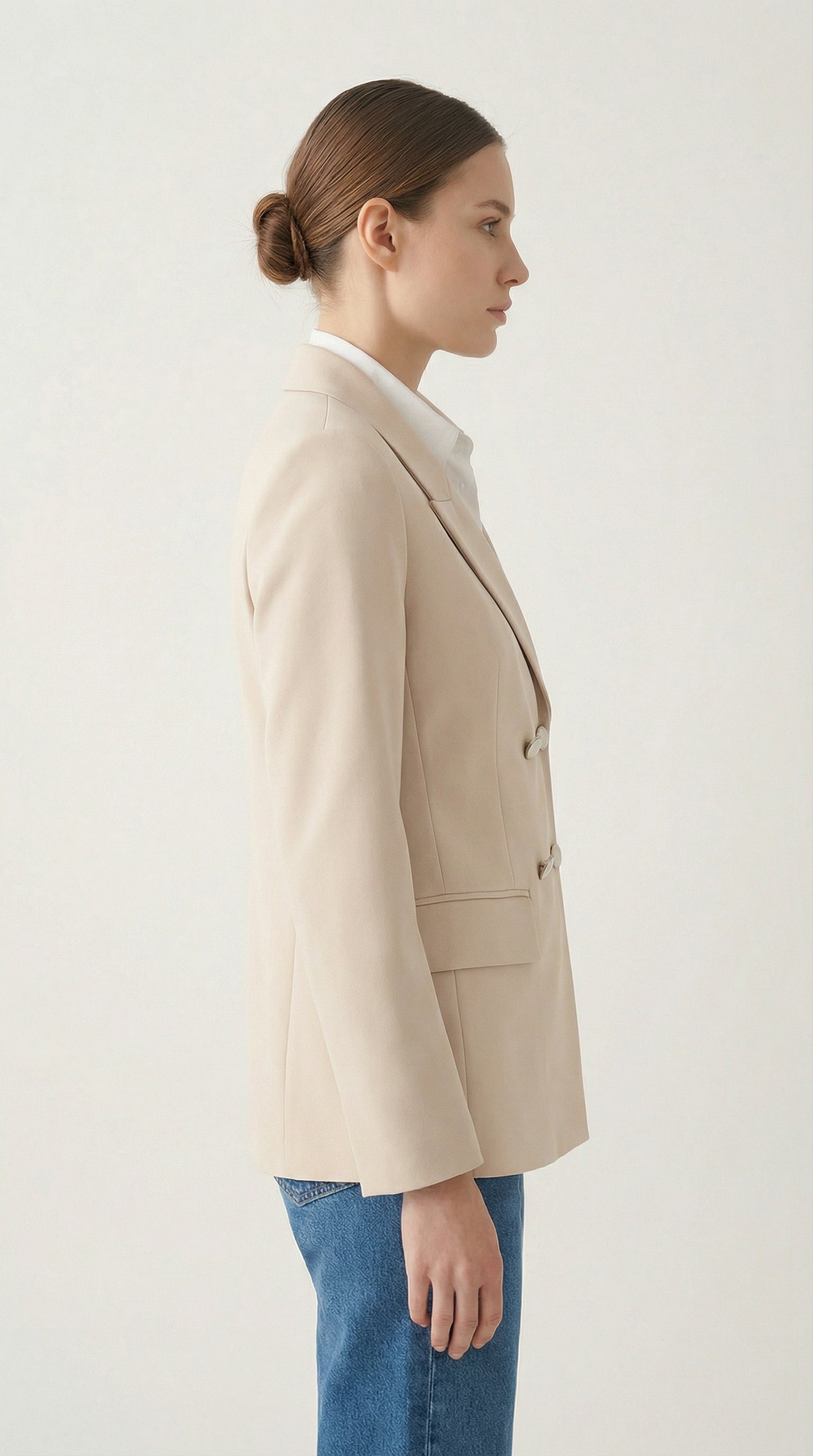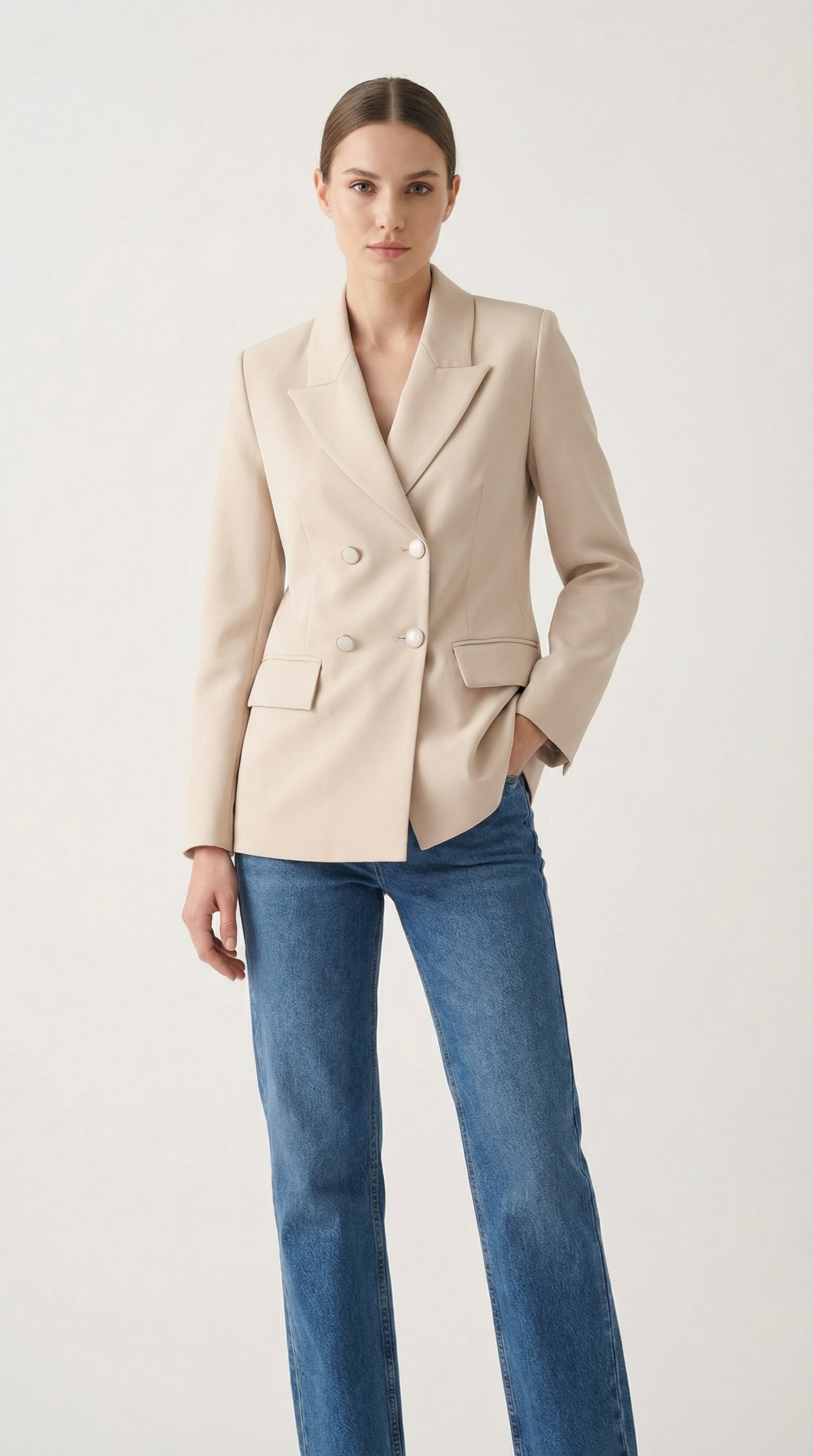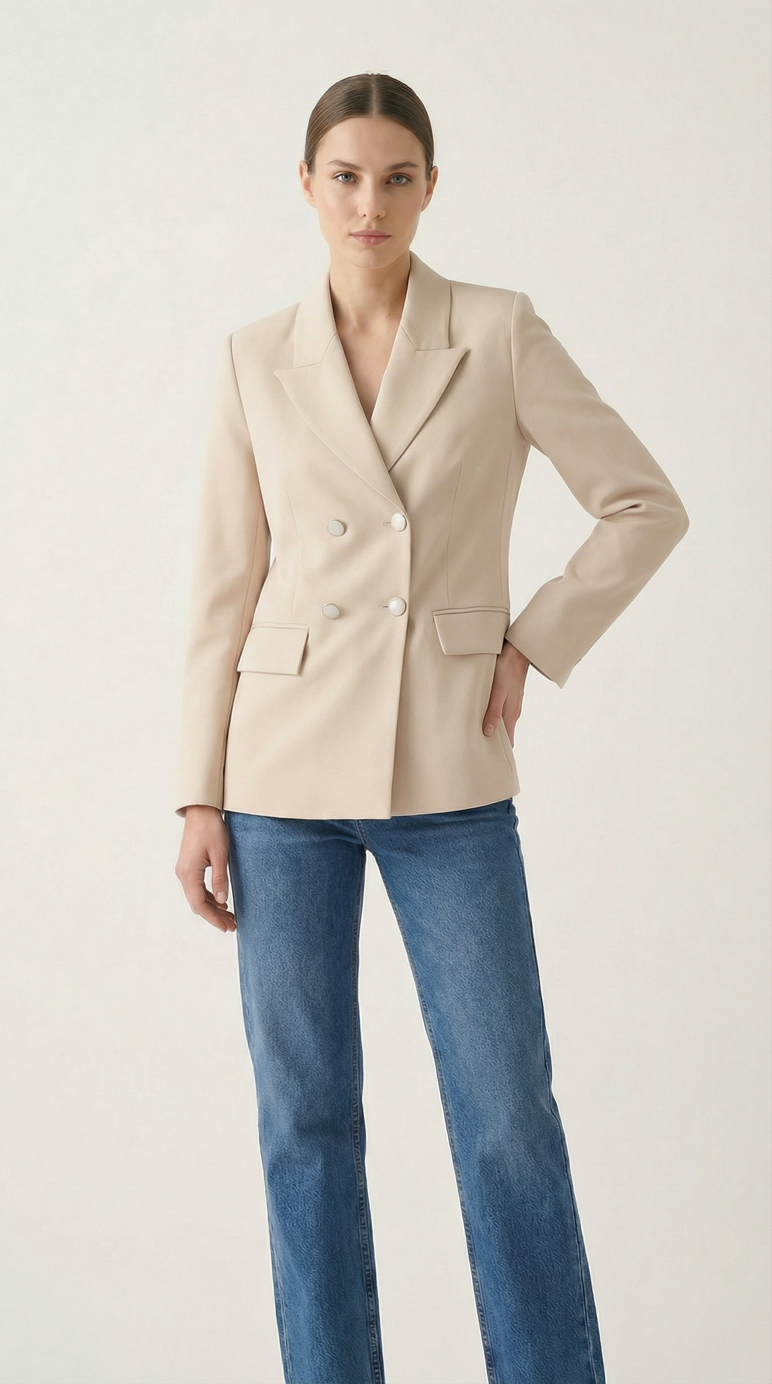 Класическо и изискано сако в мек бежов нюанс – идеалният избор за модерна и уверена визия. Моделът е с двуредно закопчаване и ефектни декоративни копчета, които добавят нотка стил и изтънченост. Изчистената кройка подчертава силуета, а висококачествената материя осигурява комфорт през целия ден.