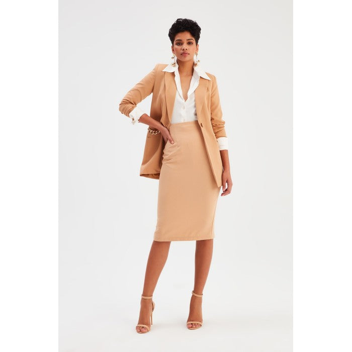 Тази изчистена и елегантна пола-молив е универсално допълнение към всеки гардероб. Пясъчно-бежовият нюанс придава топлина и стил, а високата талия и прецизната кройка подчертават силуета. Перфектна за офис, бизнес срещи или специални поводи.