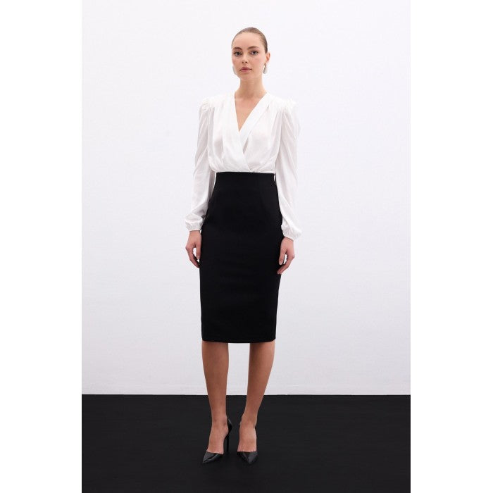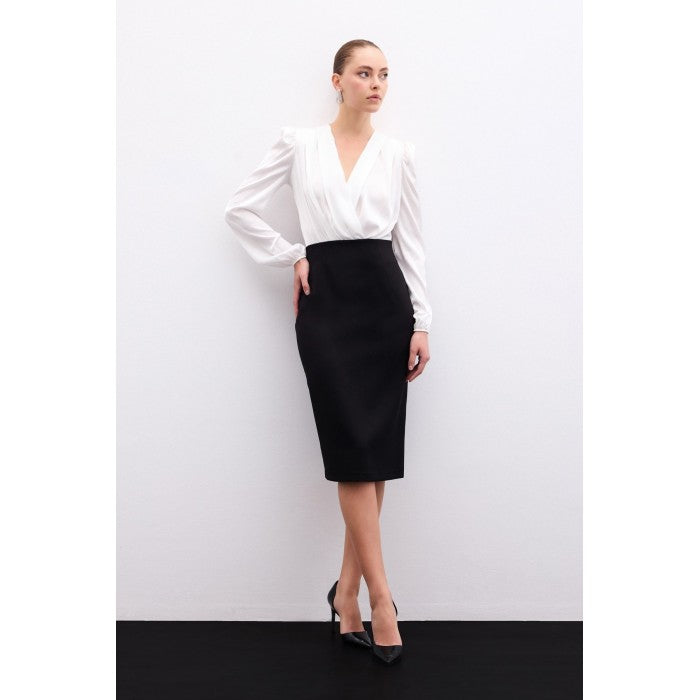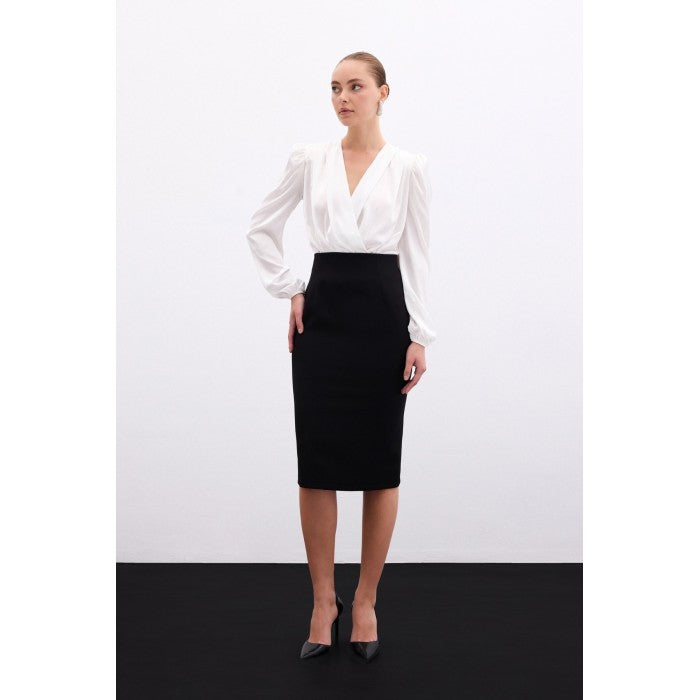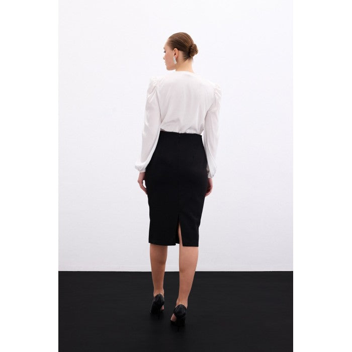 Тази елегантна черна пола-молив е символ на вечна класика. Миди дължината и изчистената кройка подчертават силуета, като същевременно осигуряват комфорт и стил. Подходяща е за офис, официални срещи или вечерни излизания.