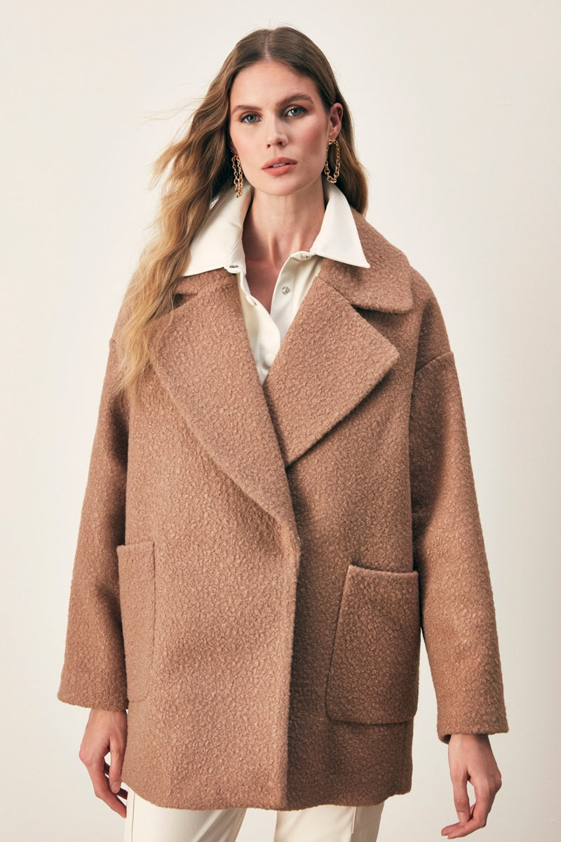 Елегантно и уютно палто от мека букле материя в топъл нюанс капучино. Моделът впечатлява с модерна, свободна кройка и обемна яка, която придава характер и женственост. Изработено от висококачествена тъкан, то осигурява комфорт и топлина през по-хладните дни, без да прави компромис със стила.