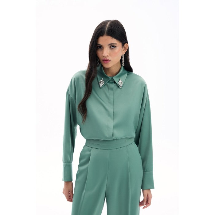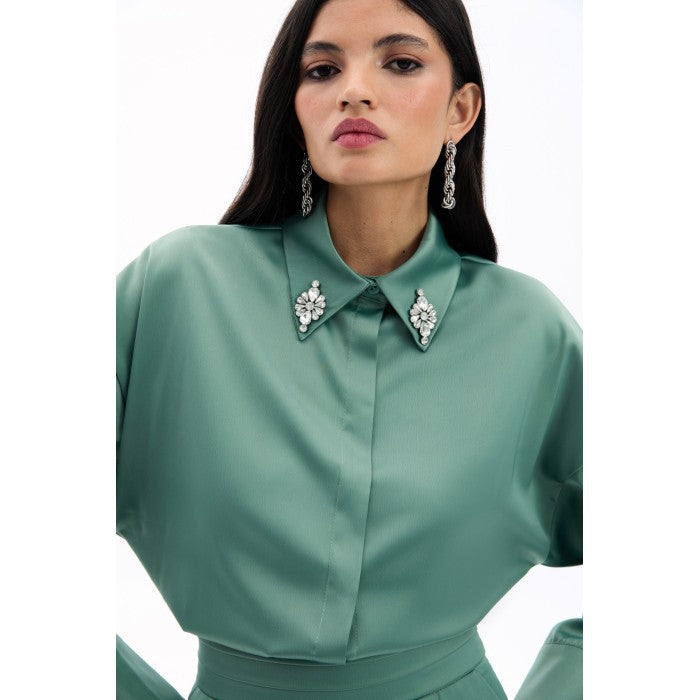 Издигнете стила си на ново ниво с тази елегантна риза в изящен зелен нюанс. Луксозната сатенена материя придава блясък и мекота, докато класическата кройка предлага комфорт и свобода на движение. Най-впечатляващият акцент са бижутерийните апликации по яката, които превръщат тази риза в истинско модно изявление.