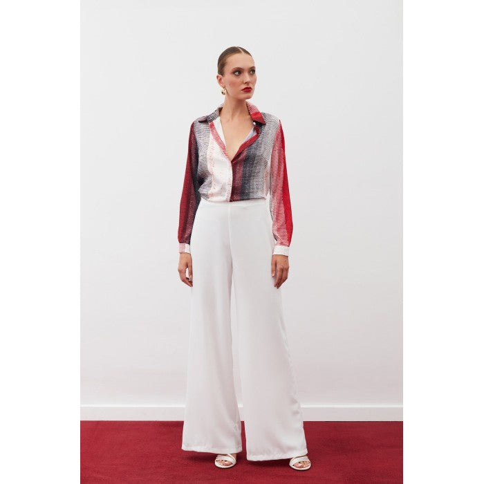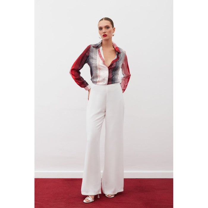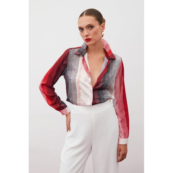 Направете впечатление с тази стилна сатенена риза, която съчетава класическа кройка с модерен принт. Контрастните линии в червено, черно и бяло създават динамична визия, която подчертава индивидуалността и елегантността. Леката сатенена материя с фин блясък придава женственост и изисканост.