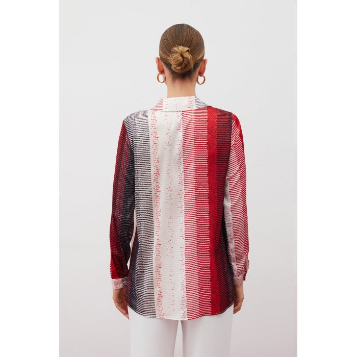 Сатенена риза с абстрактен райе-десен в червено и черно