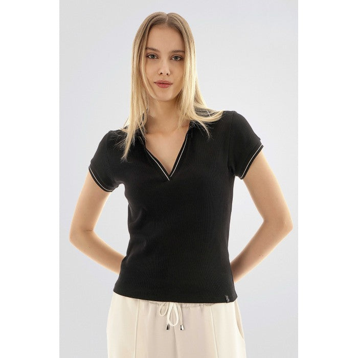 Тази черна рипсена тениска е стилно и удобно допълнение към ежедневния гардероб. Моделът се отличава с яка и V-образно деколте, подчертани с контрастни бели ленти, които добавят изтънченост към визията. Леката еластична материя осигурява комфорт и прилепва леко към тялото, без да ограничава движението.