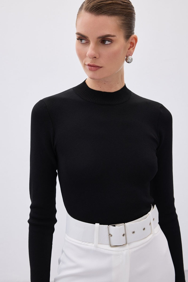 Изчистено и елегантно полуполо в черен цвят — универсална дреха, която effortlessly съчетава комфорт и стил. Изработено е от мека, еластична и фино оребрена материя, която прилепва по тялото и подчертава силуета, без да ограничава движението. Подходящо е както за носене самостоятелно, така и като основа под сако, жилетка или палто.